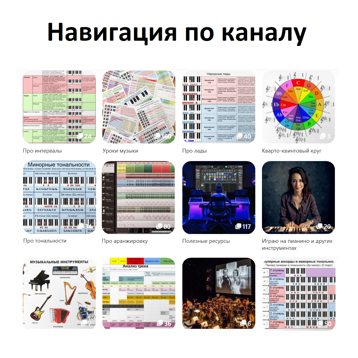 Здесь вы найдете основные разделы моего канала, чтоб вам легче было ориентироваться среди тем. Жмите на подходящую ниже подборку 👇 и изучайте материалы. Приятного чтения и просмотра! Про аккорды Про тональности Про интервалы Про лады Про кварто-квинтовый круг Клавишные, пианино, фортепиано (синтезатор) Про аранжировку Анализ профессиональных треков, произведений Создаю треки, музыкальные произведения Уроки по созданию красивых мелодий Жизнь музыкантов Играю свою музыку на пианино и других музыкальных инструментах Полезные ресурсы музыкантам