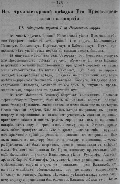 В числе других церквей Невельскаго уезда Преосвященнейший Серафимь посетил пять церквей 4-го округа: Мошенинскую, Псовскую, Кадоловскую, Поречьевскую и Клювникскую. Почти тринадцать лет упомянутые церкви не видели своих Владык. 28 минувшего июня, из села Завережья, 1-го Невельского округа, Его Преосвященство отбыл в село Мошенино. По пути Владыку встречали крестьяне расположенных при дороге деревень, с иконами и хлебом с солью. В имении Симоново, где была перепряжка лошадей архиерейскаго поезда, Владыка по приглашению владельца имения - директора Псковского Кадетскаго Корпуса, Владимира Александровича Шильдера, заезжал в его дом и, откушав предложенный чай, отравился в дальнеший путь. В селе Мошенино Владыку встречал священник, Псовской церкви Федор Чулков, так как за выходом заштат священника Федора Цытовича, священническое место было еще но замещено. После обычной встречи, Владыка из алтаря направился к правому клиросу и обратившись к стоявшим ученикам местной церковно-. приходской