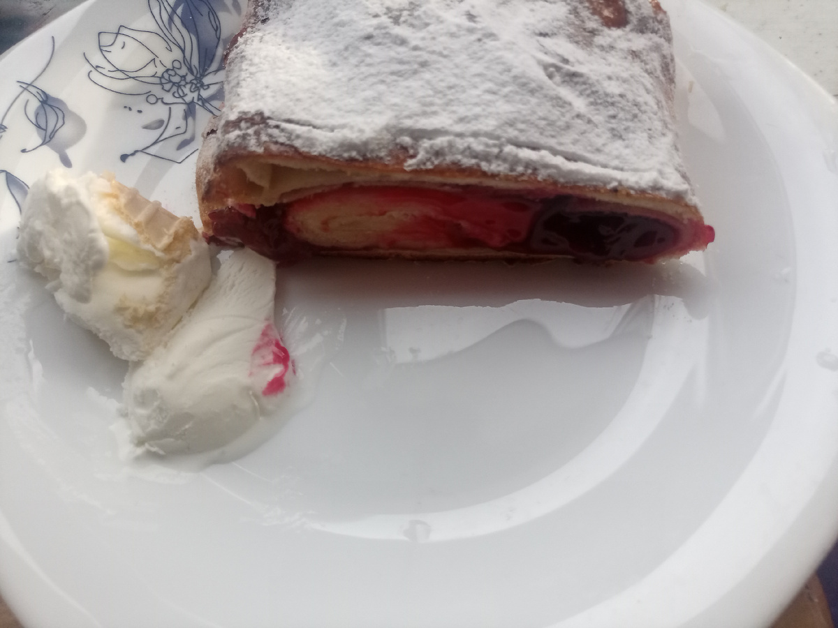 Теперь нарезаем, еще теплый штрудель, кладем на него или рядом кусочек (в идеале шарик) мороженного...