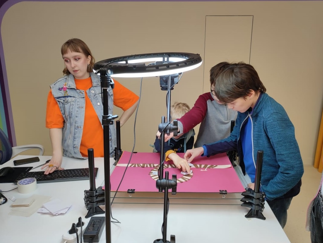 А вот это главная фишка экскурсии! В зале для мастер-классов все дети должны сначала нарисовать, а потом вырезать персонажа. Он должен быть небольшой и, желательно, яркий. Чтобы потом стать героем общего мультика. Мультфильм создается на специальном столике, на который направлена лампа и видеокамера. После его создания, все просматривают мультик два раза. А в течении нескольких дней после экскурсии, его присылают на почту, указанную при регистрации. Он должен выглядеть, как настоящий – с титрами с ФИО всех детей и с музыкой.