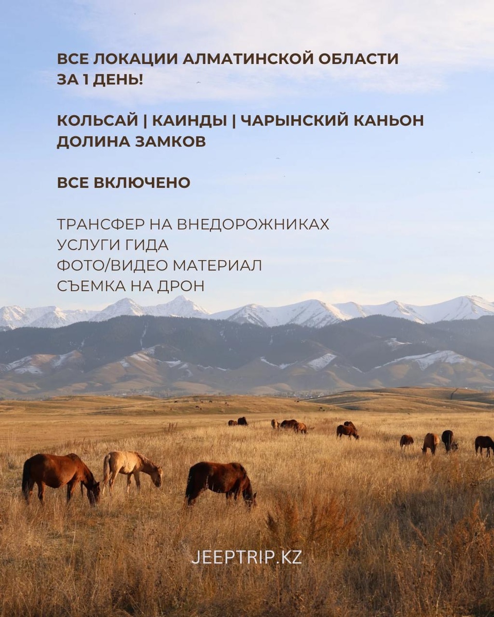 Однодневный джип-тур по ключевым локациям Алматинской области с JEEPTRIP 🚙 Всего за один день вы сможете увидеть потрясающие озера Каинды и Кольсай, исследовать Черный и Чарынский каньоны, уехать от толп и наслаждаться уединением в самых живописных местах 🌄 Вас ждут великолепные фото, чистый воздух и атмосферный отдых вдали от городской суеты. Присоединяйтесь к нам и откройте невероятные пейзажи Алматинской области с JEEPTRIP!