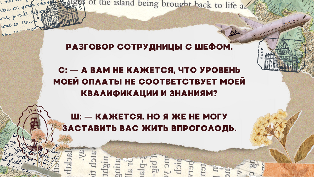 — Владимир Сергеевич, я оценила работу в гостинице, но, к сожалению, мне не видится смысла продолжать там, где мою работу не оплачивают по достоинству!