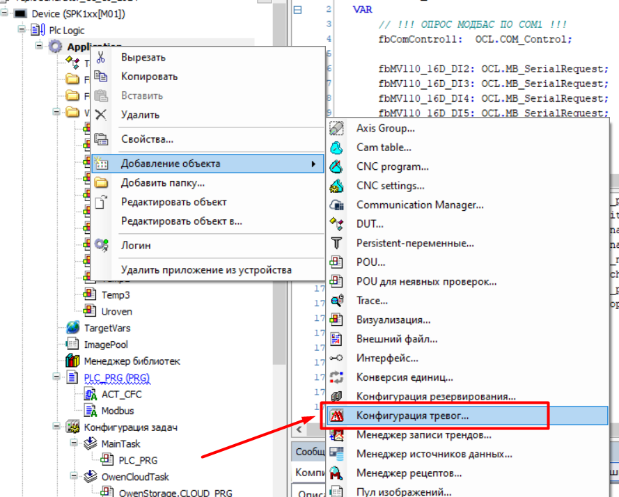 Приветствую всех. Эта статья будет посвящена дистрибутиву CoDeSyS 3.5 SP17 Pacth 3 и панельному контроллеру ОВЕН СПК107. Как сделать журнал аварий? Если есть вопросы, пишите комментарии в телеге. При желании можно отправить свой проект с фотографией и со своей подписью в каталог проектов. Аварии бывают разные - предупреждение, аварии и сообщения. Ну смысл такой, что их нужно где-то отображать и фиксировать для своевременного реагирования персонала на внештатную ситуацию. В CoDeSyS 3.5 это достаточно глубоко продумано. Создаем проект. И добавляем в дереве проектов менеджер Аварий. Добавляем Конфигурацию тревог. Error, Info, Warning - это у нас классы, где мы настраиваем цвет сработанной аварии, цвет квитирования и цвет отмеченной аварии. и, соответственно шрифт текста. AlarmStorage - это настройки хранилища, где будем архивировать аварии. После этого добавляем группу тревог и список сообщений. Получаем вот такой список элементов. Настраиваем классы аварий, цвет, шрифт, действия, способ
