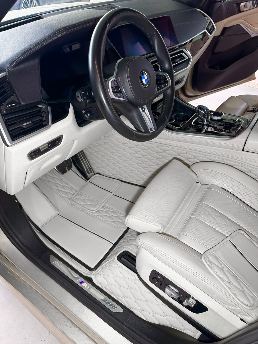 Комплект белоснежных 3D-ковриков для BMW, созданный из немецкой эко-кожи, представляет собой образ тихой роскоши, достигнутый с помощью абсолютно идентичного дизайна оригинальных кресел. Благодаря этому салон выглядит невероятно целостно, полностью в одной стилистике.