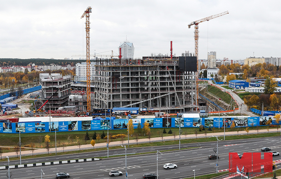 Сейчас на стройке в две смены трудятся более 350 рабочих, а также инженерный персонал. На площадке задействованы три подъемных крана и три бетонораздаточные стрелы. В месяц монтируют один этаж небоскреба. Генподрядчик на объекте — «Газпромстрой». Корректировку документации выполняет «Минскпроект».