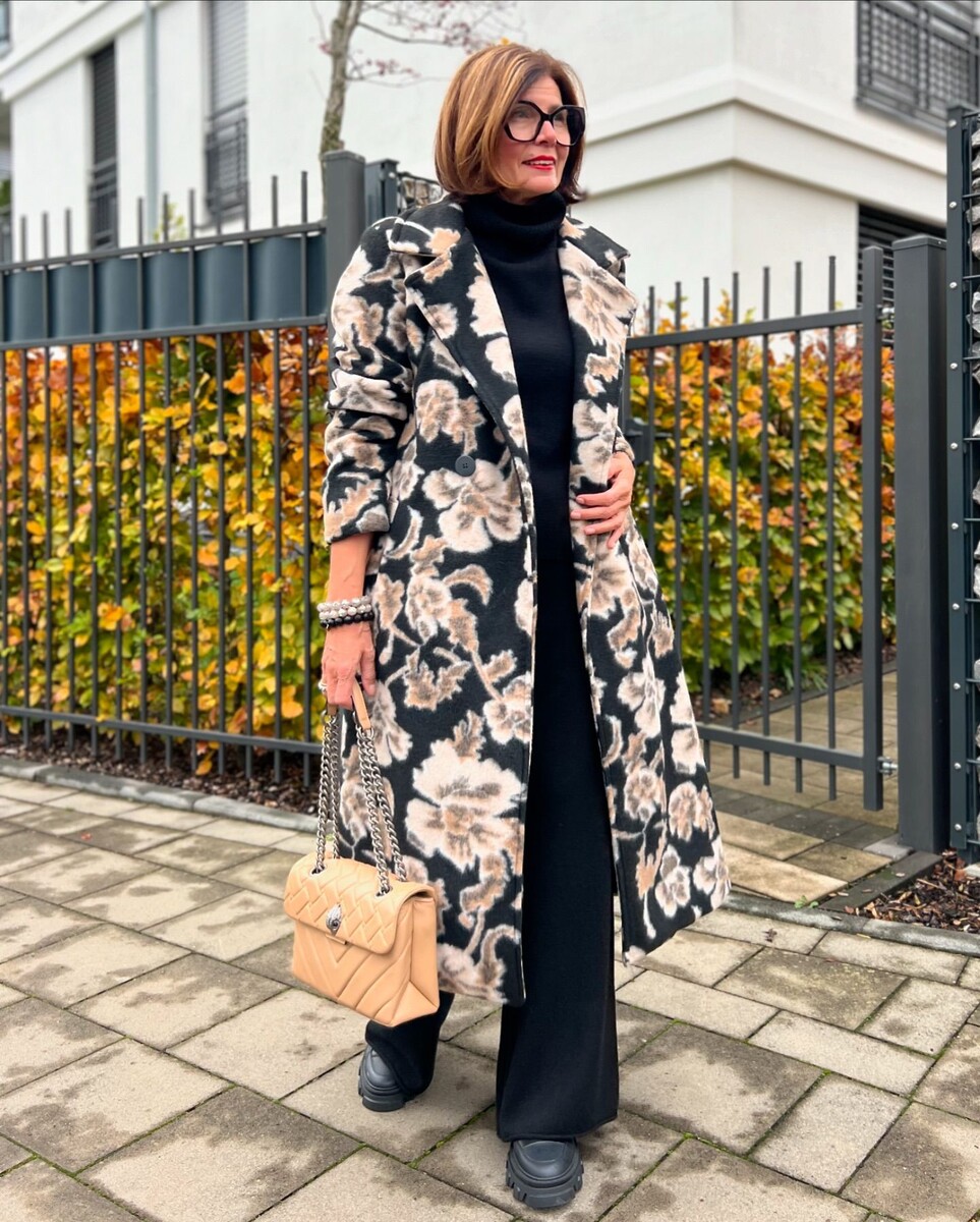 Флористические мотивы отлично вписываются не только в летние ансамбли. Посмотрите, как здорово пальто с цветочным принтом освежает черный монохром. Бижутерия и фактурная кремовая сумка ничуть не выбиваются из образа.