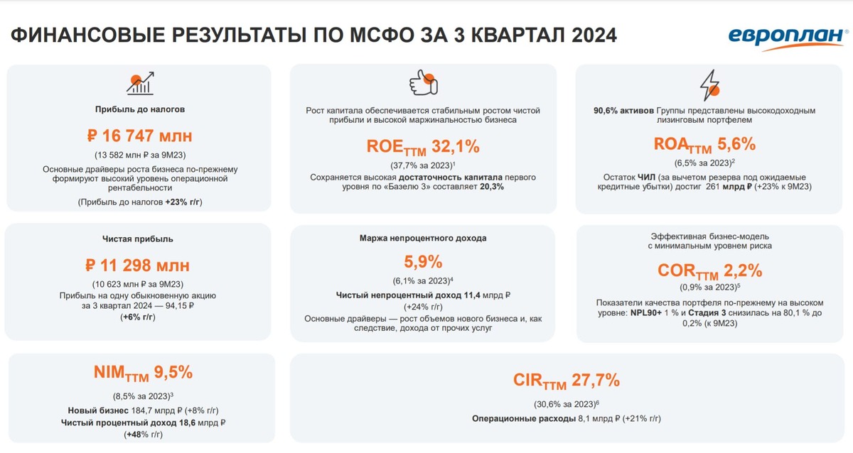 • Третий квартал показал, что темпы роста Европлана начали замедляться на фоне высокой ключевой ставки и снижения спроса со стороны лизингополучателей. Процентные расходы и резервы компании значительно увеличиваются, однако даже при огромной переоценке налоговых обязательств чистая прибыль за 9 месяцев показала рост. Несмотря на замедление темпов роста бизнеса, Европлан направляет на дивиденды рекордную сумму, что может привлечь внимание инвесторов.