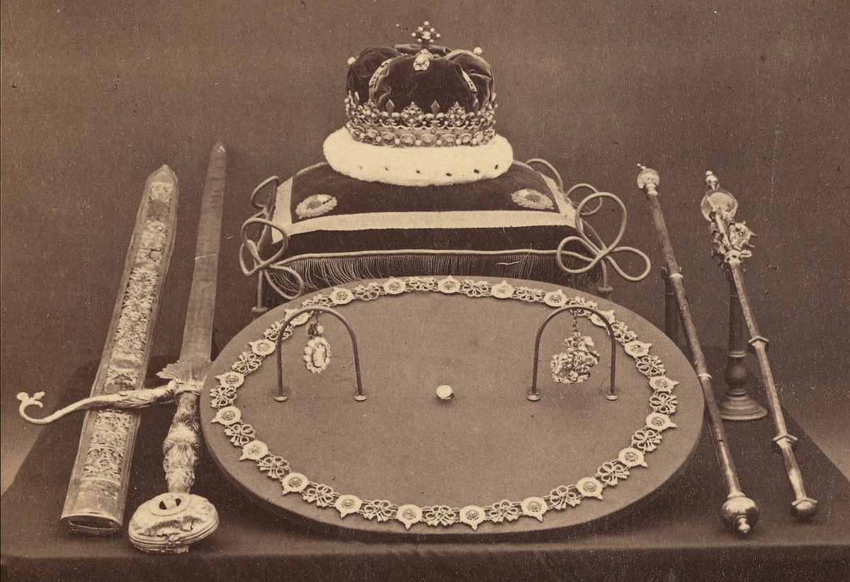 Помнится, среди мятежной компании времён моей развратной юности, был пьяный старый тори, который пел балладу, составленную об этих самых регалиях во времена Унии, в которой они все были предназначены для самых низменных целей; корона, например: