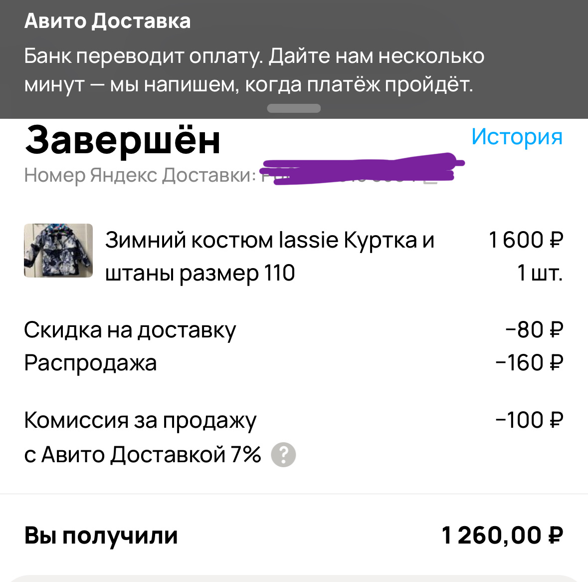 Зимний костюм Lassie в размере 110 (сейчас сын уже носит 134), я не могла продать несколько лет, что удивительно, ведь комплект в состоянии нового, а цена низкая. Конечно, я добавила костюм в Авито распродажу, перед этим сделав и загрузив обновленные фотографии. И решила протестировать скидку на доставку, ведь со слов Авито, это должно привлечь внимание клиента! Что в итоге помогло больше- распродажа или скидка на доставку- я не знаю, вероятно, оба момента… Главное, зимний костюм был заказан и выкуплен клиентом! Начальная стоимость 1600₽. С учетом всех скидок и комиссии, я получила за продажу 1260₽. И огромную благодарность от покупательницы, что оказалось безумно приятно! Я словно почувствовала, что к заказу нужно добавить подарок в виде зимних брюк Lassie (я их покупала на смену для данного костюма). Сейчас лишь жалею, что постеснялась положить и другую одежду подходящего размера… Честно, я даже чуть прослезилась. Мама ребенка находится в подобной ситуации, что и я! И моя небольшая