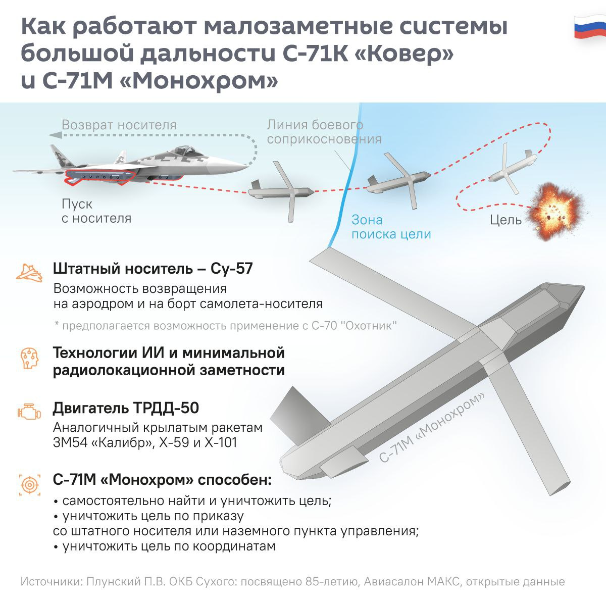 О работах над С-71К "Ковер" и С-71М "Монохром" рассказывается в книге "ОКБ Сухого. Посвящено 85-летию". Что это за изделия? Разбирался @sputnik_rus ▪️ Куда летит "Ковер". Первый из двух вариантов получил название С-71К "Ковер". Это малозаметная крылатая ракета-авиабомба (аналог новой AGM-154 Joint Standoff Weapon) для поражения целей по известным координатам, говорится в книге Павла Плунского. ▪️ Умный поводырь "Монохром". С-71М – это автономный барражирующий боеприпас, который способен уничтожать цели и, предположительно, координировать своих "братьев" – "Ковров", а возможно, и другое вооружение Су-57. В этом ему помогает ИИ с возможностью машинного зрения. ▪️ Принцип работы изделий. Эксперты полагают, что С-71М и С-71К будут запускаться совместно. "Ковры" будут получать команды от "умного собрата". "Монохром" будет искать врага, принимать решение на уничтожение цели и передавать задачи с наземного или воздушного пункта управления. Ничего сверхъестественного в этом нет. Похожие решен