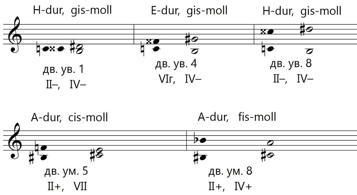 Дважды увеличенные и дважды уменьшенные интервалы - прежде всего, из интонационного арсенала XX-го века. Обычно двойной альтерации подвергаются чистые интервалы. Дважды увеличенная кварта звучит как квинта, дважды уменьшенная квинта как кварта, из октавы получаются малая септима и большая нона. Но разрешаются они просто: всегда на малые секунды в разные стороны (увеличенные увеличиваются, уменьшенные уменьшаются).