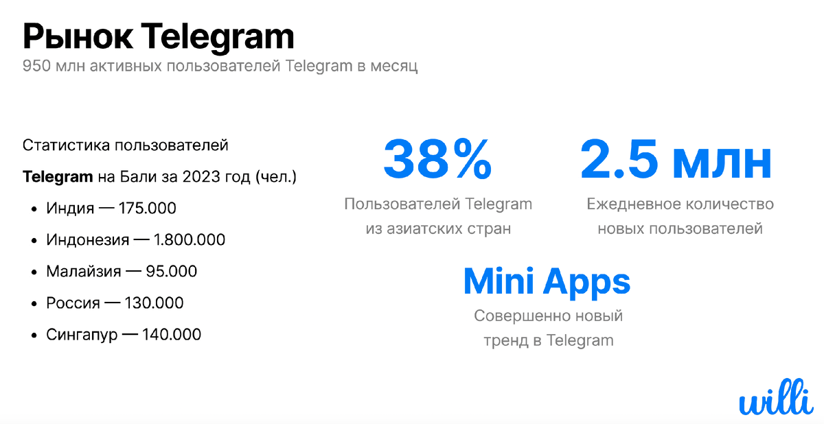 Сегодня Telegram — это не просто мессенджер, а полноценная платформа для бизнеса и повседневных задач. С появлением миниаппов он открыл новые возможности для создания удобных сервисов. Мы запустили Willi как решение для поиска жилья на Бали, но это только начало: похожая проблема существует во многих странах. Представьте, что искать жильё теперь можно прямо в Telegram — быстро, удобно и без хаоса. Бали — это идеальная стартовая площадка для MVP нашего продукта. Вот почему: Мы решили исправить эту ситуацию с помощью Willi, предлагая пользователям всё необходимое для поиска жилья в одном месте. То, что мы видим на Бали, — это лишь часть глобальной тенденции. Telegram-чаты для аренды жилья популярны также в: Каждая из этих стран сталкивается с похожими трудностями: пользователи выбирают Telegram за его удобство, но теряются в огромном объёме несортированной информации. Мы верим, что Telegram — это идеальная платформа для поиска недвижимости: Willi — это наш первый шаг к тому, чтобы сдел
