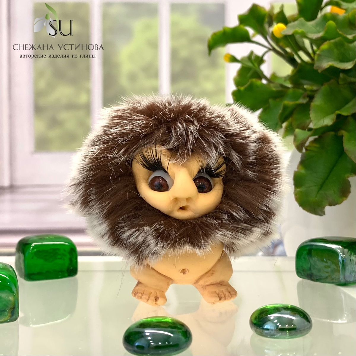 Как-то в один прекрасный день, я взяла в руки кусочек холодного фарфора, даже не подозревала, что именно он станет началом создания моего домовенка “Стиляги”. Вместе с идеей в голове, я начала лепить, веря, что из этой глины родится нечто особенное. Образ домовенка долго не давал мне покоя: каким должно быть его тело? Может, чуть сгорбленным, чтобы выглядел любопытно, как будто он заглядывает за угол? Или с круглым животиком, как у любителя домашних пирогов? Форма головы и выражение лица — вот где я провела больше всего времени. Хотелось, чтобы он светился озорством и теплотой, поэтому я «дорисовала» ему слегка заостренный нос и пухлые щечки. Казалось, что каждое мое прикосновение вдохнет в него жизнь. Выбрав для него карие глаза, я подумала, как здорово они подчеркнут его веселый и обаятельный характер. Длинные и выразительные ресницы дополнили его взгляд, сделав его по-настоящему живым и даже кокетливым. Процесс создания волос был отдельной историей. Я решила использовать мех кро