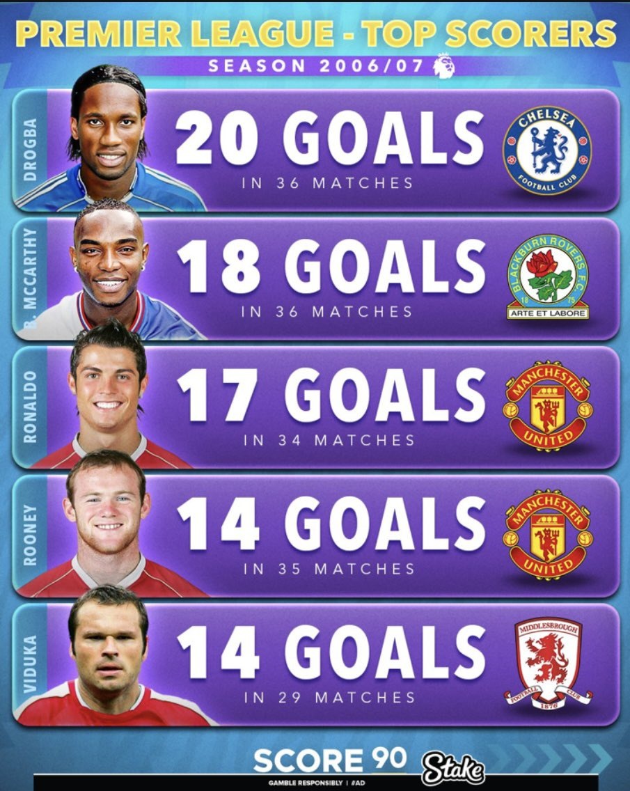 За долгие годы АПЛ повидала множество выдающихся голеадоров, некоторым удалось навсегда вписать свое имя в историю. Портал Score90 вспомнил пятерку лучших бомбардиров АПЛ, начиная с сезона-2006/07 и заканчивая современностью. Вышло весьма любопытно! Сезон-2006/07 В очередной чемпионский сезон «Манчестер Юнайтед» лучшим бомбардиром лиги стал Дидье Дрогба, забивший 20 голов в 36-ти матчах. Сезон-2007/08 У Криштиану Роналду на 11 голов больше, чем у Дрогба в предыдущей кампании. Вместе со званием лучшего бомбардира португалец забрал чемпионский титул. Сезон-2008/09 Николя Анелька из «Челси» на один мяч обошел Криро в бомбардирской гонке, но чемпионство вновь забрали «красные дьяволы». Сезон-2009/10 Дидье Дрогба превзошел собственное достижение и помог «Челси» завоевать долгожданный титул. Сезон-2010/11 Чемпионом опять стал «МЮ», а звание лучшего бомбардира разделили представители Манчестера – Карлос Тевес и Димитар Бербатов. Сезон-2011/12 «Ман Сити» с молодым Агуэро в составе впервые офор