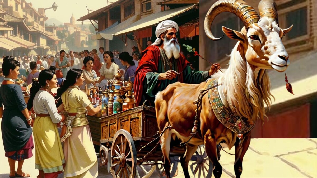 - пожилой торговец показывал свои товары собравшимся вокруг него девушкам. Они же послушно наносили на свои веки и губы косметические средства. Глаза селянок горели – еще бы, любая сразу преображалась – и пожилая и совсем юная… Это было настоящее волшебство!