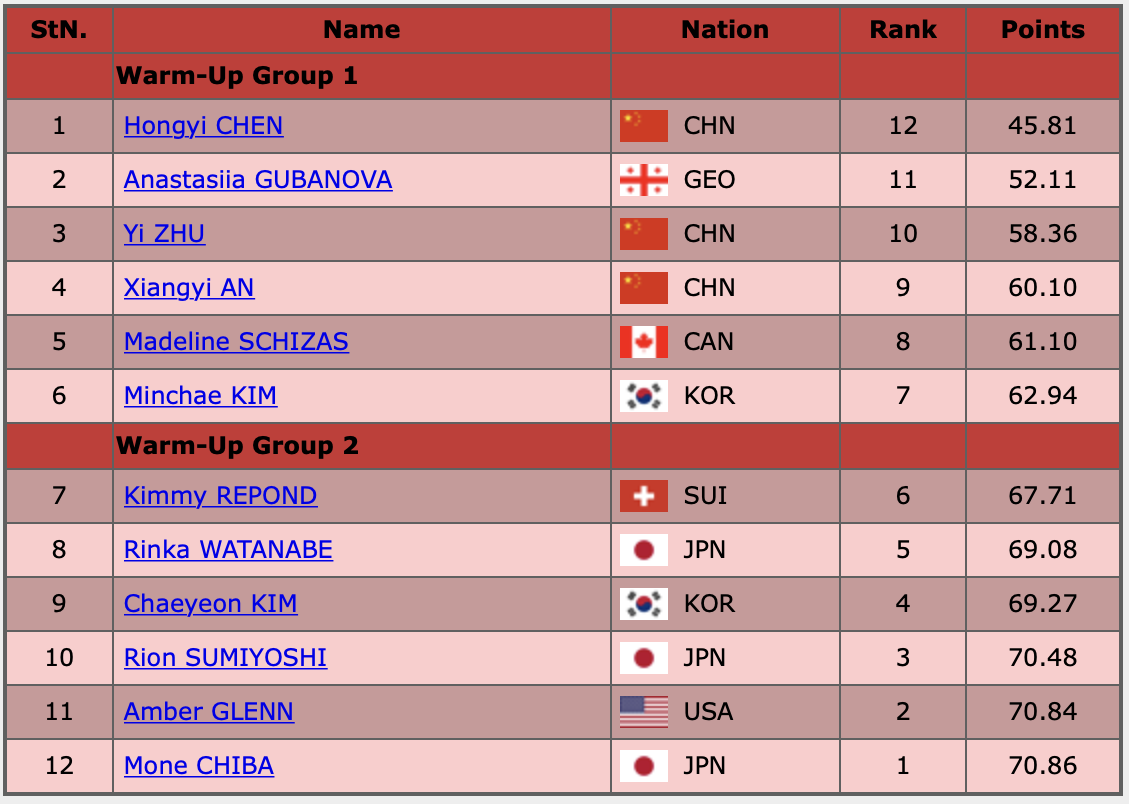 Список участниц в порядке выхода на лёд и баллы первого дня:
