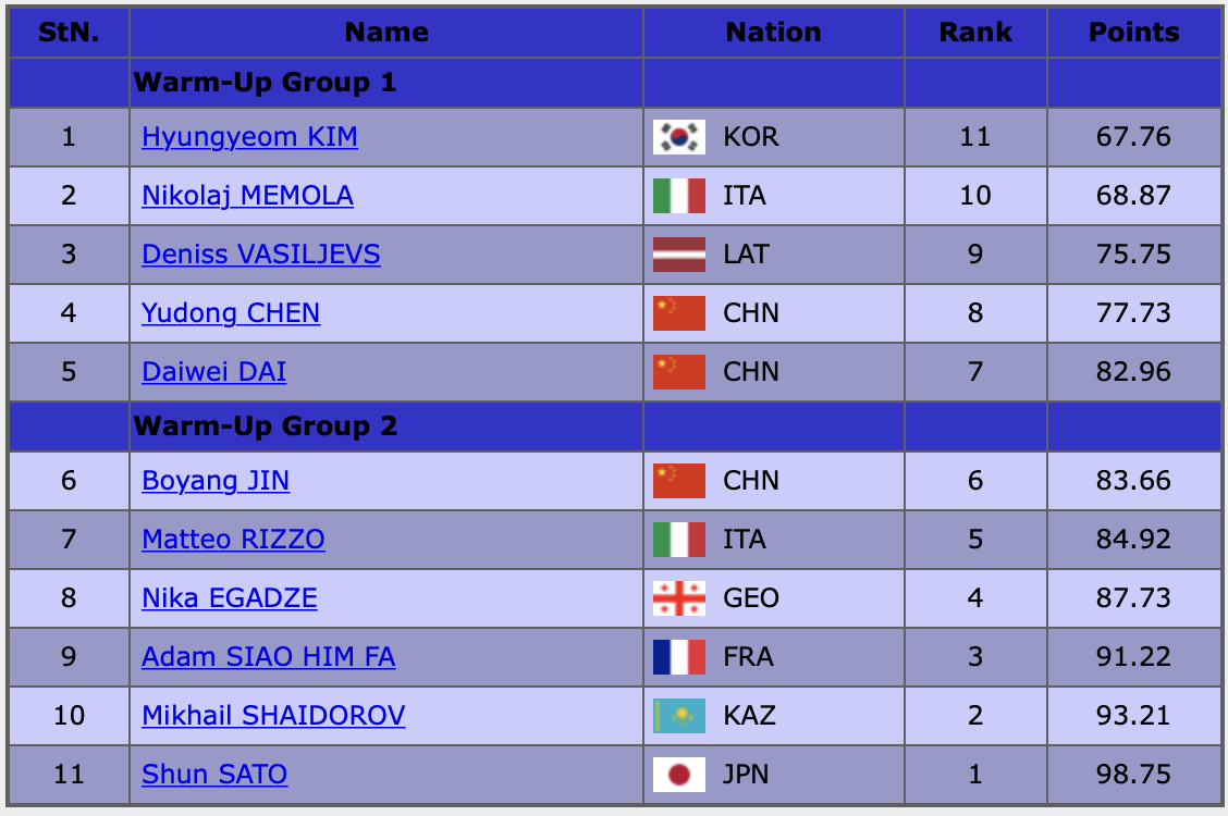 Баллы первого дня и порядок выхода спортсменов на лёд: