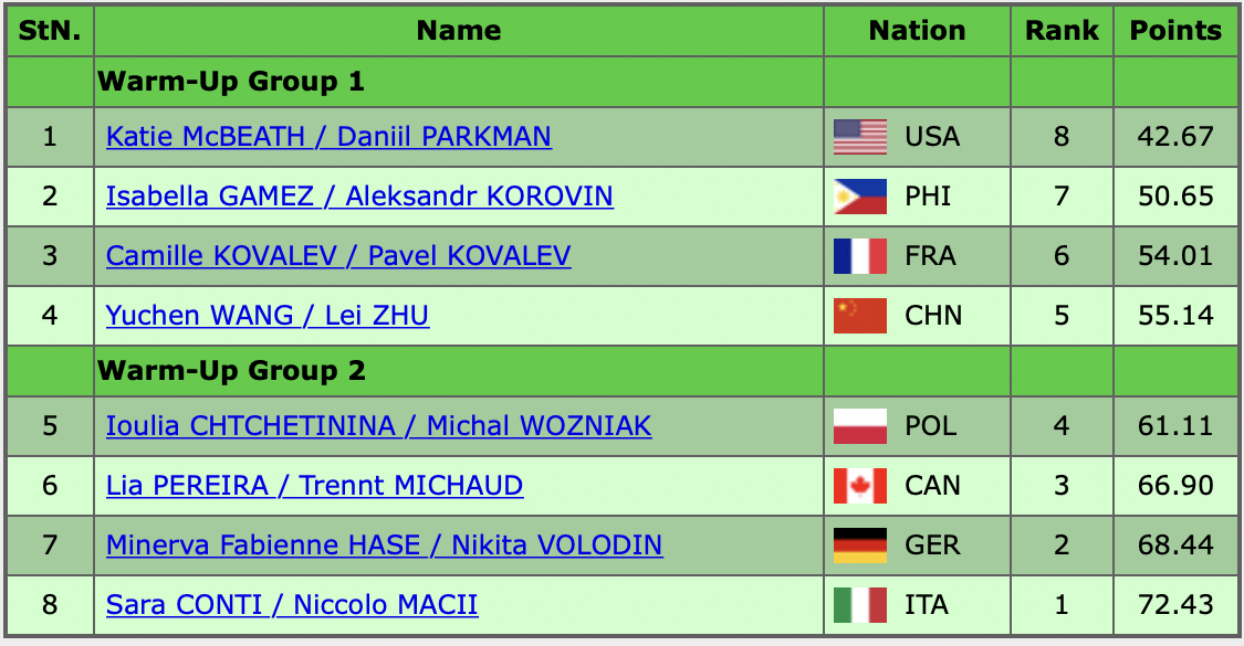Баллы первого дня и порядок выхода спортсменов на лёд: Подкрутка 3 уровня. Каскад из тройного тулупа и двух двойных акселей не синхронно. Сальхов получился только двойной и тоже не параллельно. Выброс-риттбергер - чисто. Тодес 4 уровня. Вращение хорошее. Выброс-лутц с ошибкой на приземлении. Поддержки 3 и 4 уровня. Программа очень ровненькая, без сложностей - чисто откатать элементы и сохранить силы к концу. Результат ПП: 117.25 Сумма: 159.92 Подкрутка только на 2 уровень. Тройной сальхов с недокрутом и падением у партнёрши. Каскад не получился - только двойной тулуп и почему-то второй прыжок вообще не стали прыгать, что странно. Видимо, каскад был на первом элементе и они не отрабатывали, что делать, если там будет падение. Выброс-риттбергер - чисто. Выброс-сальхов - с ошибкой. Поддержки на 3 и 4 уровни. Тодес 3. Здесь тоже программа из серии "хоть бы докатать". Результат ПП: 100.61 Сумма: 151.26 Подкрутка только 1 уровня. Сальхов лишь двойной - вроде бы партнёр ошибся. На каскаде бы