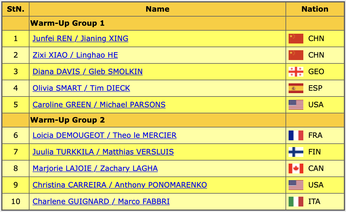 Список участников и порядок выхода на лёд: Дорожка шагов на 2 уровень у обоих. Твизлы на 4 уровень. Паттерн чистый. Неплохая хорео секвенция. И в конце поддержка. Мне не хватило слаженности. И программа сама по себе была скучной: абсолютно проходная история, которая не запоминается. Хореографии как таковой не было. Результат КП: 61.64 Дорожка шагов 1 и 2 уровня у обоих. Твизлы 4 уровня у обоих. Паттерн базового уровня. Хорео секвенция слабая. В конце вращение получилось. Та же самая проблема, что и у первой пары: нет программы, мало хореографии, абсолютно неинтересно. Результат КП: 59.96 Дорожка по центральной оси 2 и 3 уровня. На твизлах была ошибка у Дианы - 2 и 4 уровень, и отминусовали. Паттерн 2 уровня. Хорео секвенция отличная. В конце вращение. Не самая удачная программа, но на фоне китайцев просто восторг. Причём разница и в постановке, и в уровне катания. Жаль, что была ошибка. Результат КП: 70.53 Сразу же вошли в твизлы - 4 уровень у обоих. Паттерн 2 уровня. Дорожка 3 и 2 у