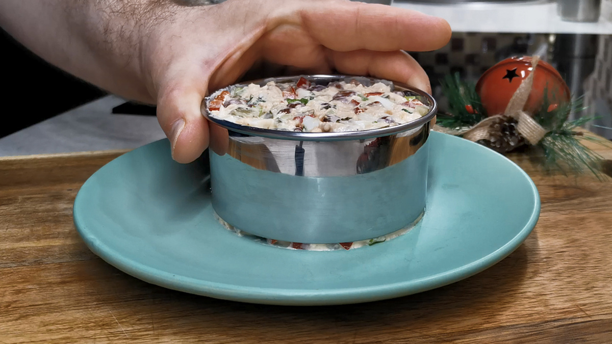 Заканчиваем с приготовлением. Переходим к подаче. Можно особо не заморачиваться и просто выставить на стол в красивом хрустальном салатнике. А можно чуть-чуть приложить фантазии и сервировать салат порционно, уложив каждую порцию в кольцо.