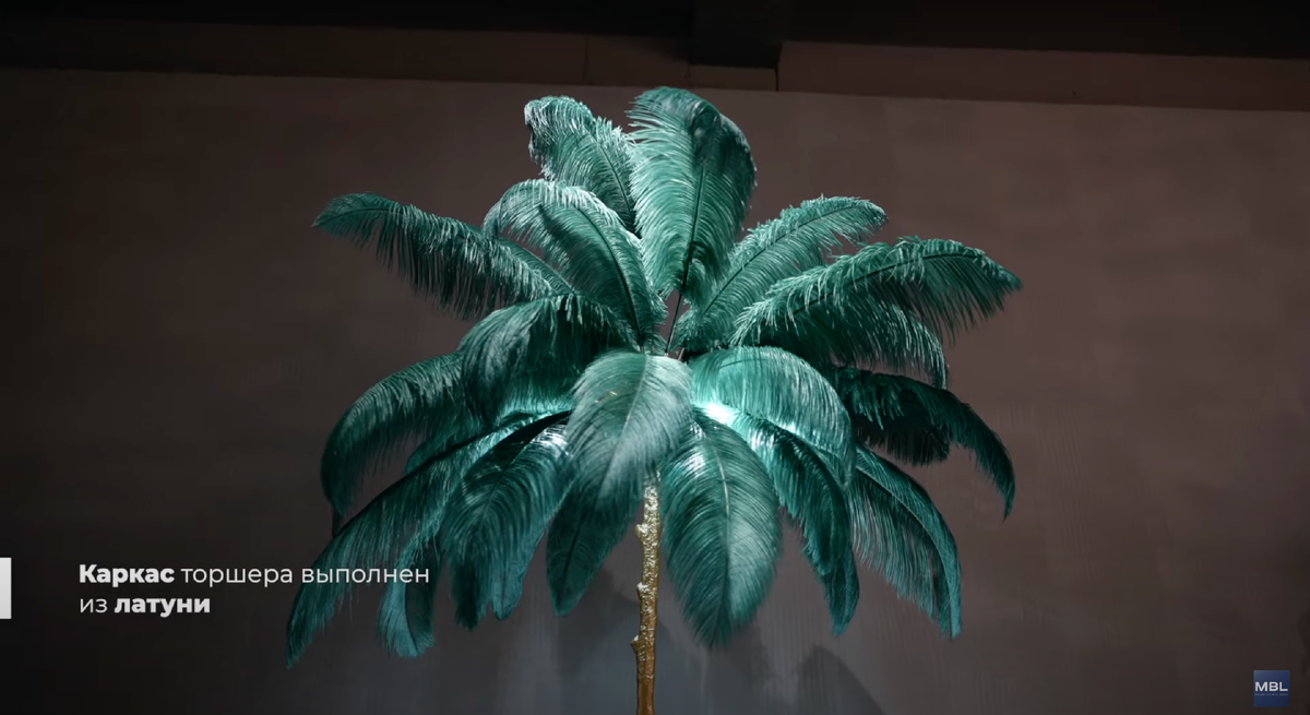 Вот, например, самое известное Инста-изделие —красивейший торшер, где каркас выполнен из натуральной латуни. А вот эти перья абсолютно оригинальные, натуральные страусиные. Причём они могут быть выполнены в разном окрасе, есть целая большая палитра. Красиво!