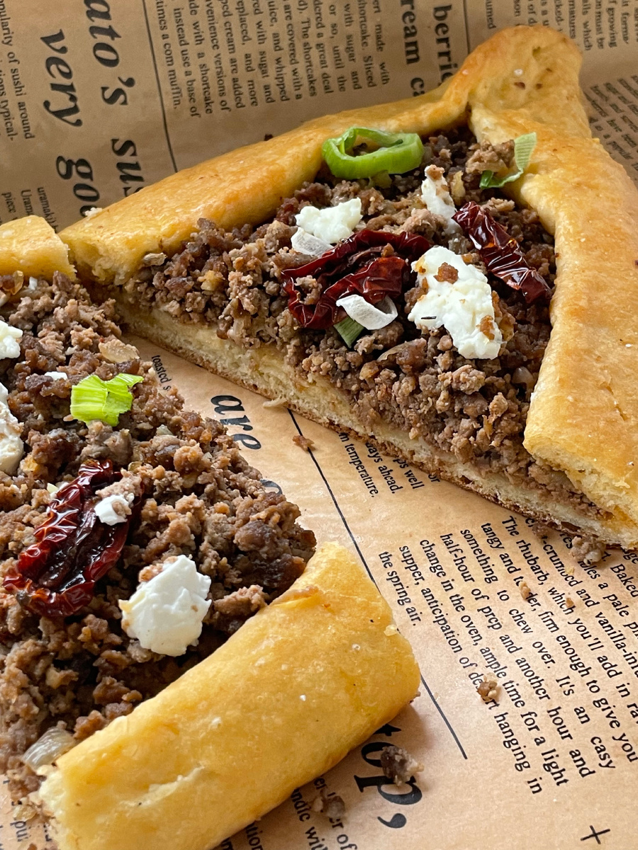 Поняла, что скучновато мне живется и решила поучаствовать в конкурсе Фестиваль южной кухни и буквально прыгаю в последний вагон, сегодня заключительный день конкурса. Посмотрела меню ресторанов и поняла, что больше всего хочется приготовить пирог открытый пиде с говядиной и сыром фета из новороссийского ресторана «Бочка 1969». Надеюсь, когда-нибудь побываю в этом городе и обязательно посещу это заведение и обязательно закажу это блюдо. А пока попробуем приготовить его сами дома. Для теста: 1 стакан тёплого молока 1 ч. ложка соли 1 ст. ложка сахара 2-3 стол. ложки растительного масла 1 пачка дрожжей 1 кг +/- муки Для начинки: 500 г говяжьего фарша 2-3 головки лука 2-3 зубчика чеснока лук порей для украшения 1 пачка сыра фета 100-150 г томатного соуса или пасты Перец, любая приправа для мяса, соль Вяленые помидоры для украшения 1 яйцо для смазывания теста В глубокую чашку наливаем тёплое молоко, добавляем, соль, сахар, масло. Всё хорошо перемешиваем венчиком. Постепенно через си