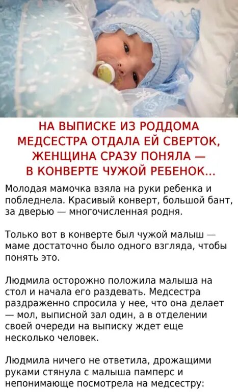 Раздражение медсестры как рукой сняло — она побежала в отделение, а через пару минут вниз спустилась заведующая с Людмилиной дочкой на руках. Она начала извиняться и объяснять, что этот мальчик тоже готовится к выписке. Точнее — к переводу в дом малютки, потому что его мама отказалась от сына.