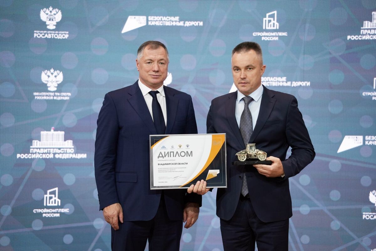 Правительство Владимирской области сообщило, что 20 ноября на XVIII Международном форуме «Транспорт России» зампредседателя Правительства Марат Хуснуллин наградил Владимирскую область дипломом и символическим «Золотым катком». В этом году статуэтку вручили 18 регионам. «Безопасные качественные дороги» – один из самых узнаваемых нацпроектов, его хорошо оценивают жители страны.. За шесть лет было построено, реконструировано и отремонтировано более 150 тыс. км дорог. Приведена в нормативное состояние дорожная сеть 105 крупнейших городских агломераций. С 2018 года уложен почти 1 млрд кв. м асфальтобетона.. В целом нам удалось справиться со всеми задачами», - отметил Марат Хуснуллин. В ходе реализации нацпроекта «Безопасные качественные дороги» в стране сформирована опорная сеть протяжённостью порядка 140 тыс. км. Ключевые элементы опорной сети и нового транспортного каркаса страны – международные коридоры и маршруты. Продолжают развиваться маршрут «Россия», коридоры «Север – Юг» и «Европа