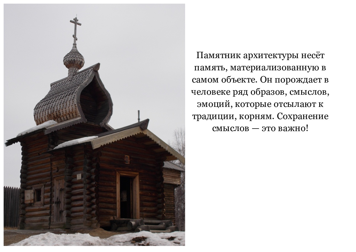 Памятник архитектуры несёт память, материализованную в самом объекте. Он порождает в человеке ряд образов, смыслов, эмоций, которые отсылают к традиции, корням. Сохранение смыслов — это важно! А порой реставрация нужна и для возрождения смыслов — утраченных и вновь обретённых.