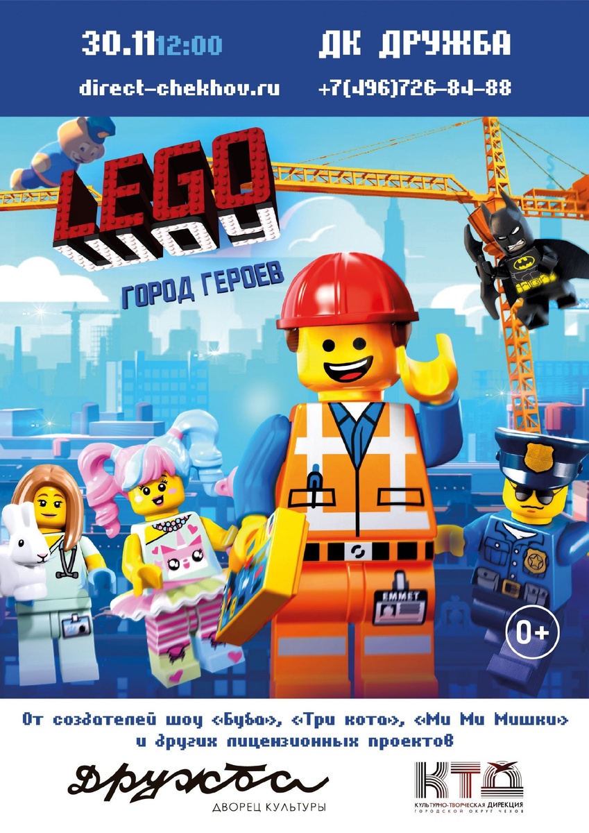 💥 Премьера интерактивного детского LEGO-ШОУ: "Город Героев" в ДК "Дружба" г. Чехов 🏗️Добро пожаловать в LEGO-ШОУ - это мир, наполненный фантастическими приключениями. 🧩В новом детском шоу мы покажем как от одного маленького кубика могут зависеть жизни тысячи людей. А еще это не просто спектакль, а настоящий праздник, где ребёнок вместе с артистами может петь, танцевать, играть и не сидеть на месте!⚡ Искрометные шутки и веселые диалоги. Профессиональные актеры и артисты. LEGO-ШОУ развивает воображение маленьких зрителей и погружает их в атмосферу города, где возможно ВСЁ. 🚫 Возраст: 0+ 📆 30.11.2024 🕕 12:00 🏢 ДК «Дружба» 📍 г. Чехов, ул. Чехова, д.45 💰 Цена от: 1000 до 1500 ₽ 🎫 Купить билет: https://clck.ru/3ELa59