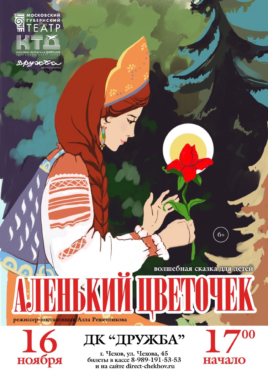 💥 Cпектакль "Аленький цветочек" по мотивам сказки С. Аксакова в исполнении Московского Губернского театра в ДК "Дружба" г. Чехов Поэтический рассказ о прекрасной девушке, которая, полюбив не за красоту, а за доброту, осталась верна своему слову. 🌺👑Отправляясь в далекое плавание, купец Иван Кузьмич обещает дочерям привезти подарки. В заморских странах купец встречает чудных иноземцев и самым таинственным из всего увиденного оказываются невероятной красоты аленький цветочек и заколдованный Принц. Продолжительность: 1 ч. 10 мин., без антракта 🚫 Возраст: 6+ 📆 16.11.2024 🕕 17:00 🏢 ДК «Дружба» 📍 г. Чехов, ул. Чехова, д.45 💰 Цена от: 1000 до 1500 ₽ 🎫 Купить билет: https://clck.ru/3E7Xrd