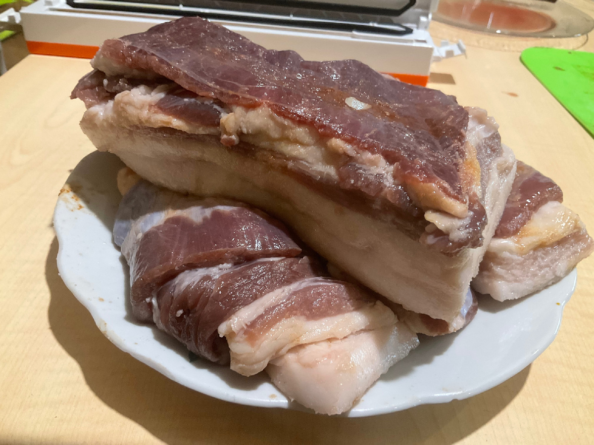 Через неделю я достаю грудинку. Ее надо «отеплить» - достать заранее из холодильника и оставить, чтоб она приобрела комнатную температуру. Я достаю примерно за час до приготовления. Затем ставлю ее вариться. У меня процесс варки происходит в автоклаве. Он поддерживает температуру 68 градусов в течение 6 часов.