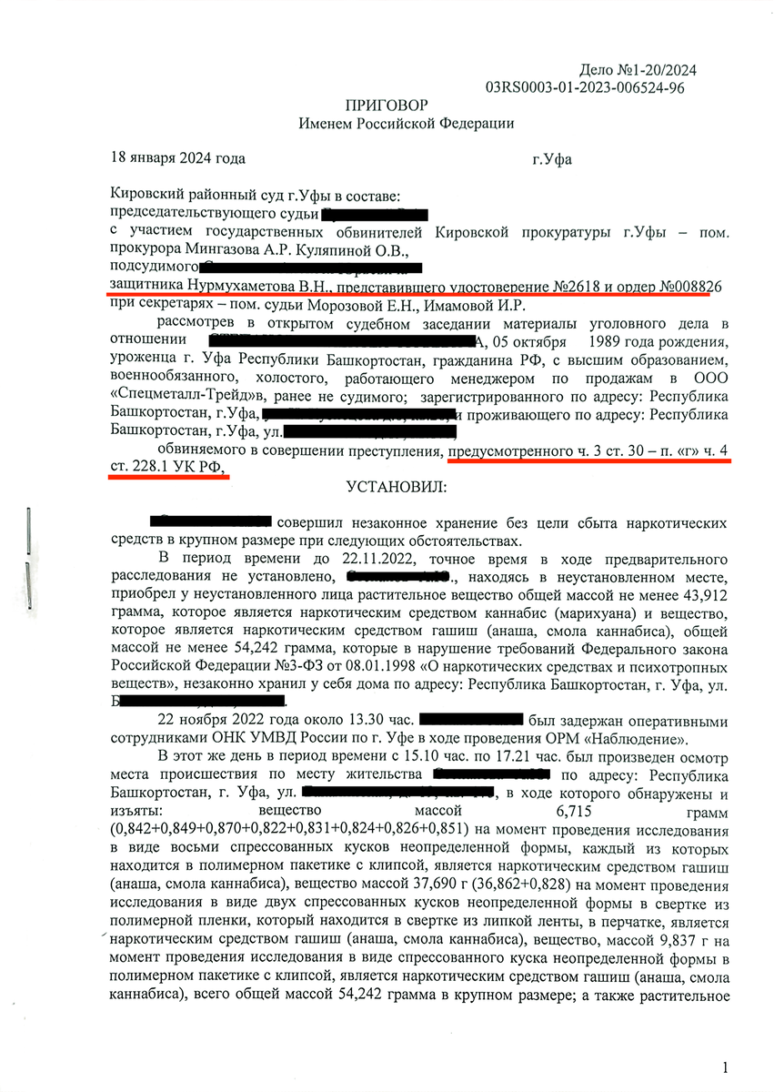 РАССМОТРИМ НА ПРИМЕРЕ РЕАЛЬНОГО УГОЛОВНОГО ДЕЛА ВОЗМОЖНОСТЬ ИЗМЕНЕНИЯ КВАЛИФИКАЦИИ СО СБЫТА НА ХРАНЕНИЕ НАРКОТИКА В СУДЕ ПЕРВОЙ ИНСТАНЦИИ В 2024 ГОДУ: Кировский районный суд города Уфы Республики Башкортостан переквалифицировал содеянное с п. «г» ч. 4 ст. 228.1 УК РФ на ч.2 ст. 228 УК РФ, по следующим основаниям: Информация в телефоне противоречила выводам следствия о причастности обвиняемого к сбыту наркотиков. На сотовом телефоне, принадлежащем Семенову А.Ю. какой-либо информации, подтверждающей причастность Семенова А.Ю. к незаконному сбыту наркотических средств не обнаружено. Из материалов дела следует, что оперативной информацией о том, что Семенов А.Ю. занимается сбытом наркотических средств, сотрудники полиции не располагали; также в материалах дела не содержится сведений о том, что в ходе оперативно-розыскного мероприятия «наблюдение» Семеновым А.Ю. были произведены действия, направленные на сбыт наркотического средства. Так же не были установлены и лица, которым Семенов А.Ю. м