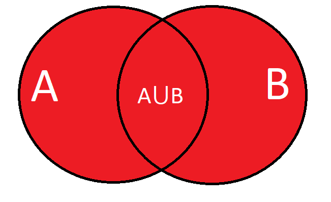 Определение. Объединение множества А и множества В называется множество A⋃B, которое состоит из всех элементов исходных множеств A и B вместе. В объединение включаются все элементы, которые присутствуют хотя бы в одном из исходных множеств. Следует отметить, что при объединении множеств общие элементы не повторяются. Пример Найдём попарные объединения множеств из опыта с кубиком: Выпадет чётное число очков. А = {2, 4, 6}; Выпадет шестёрка. В = {6}; Выпадет простое число. С = {2, 3, 5}. Объединения: A⋃B = {2, 4, 6}, A⋃C = {2, 3, 4, 5, 6}, B⋃C = {2, 3, 5, 6}. Объединение множеств легко представить с помощью диаграммы Эйлера. Левый круг на диаграмме соответствует множеству А, правый — множеству В. Фигура, образованная двумя кругами, представляет собой объединение этих множеств, обозначаемое как A⋃B. Варианты взаимного расположения множеств при их объединении 1. Если два множества имеют общую часть, то их объединение включает в себя все элементы, которые принадлежат обоим множествам, вклю