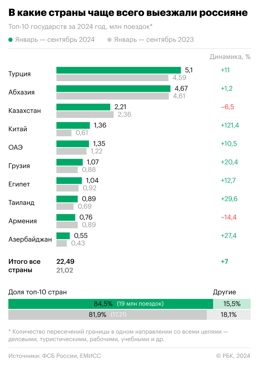 За девять месяцев 2024 года число выездов россиян за границу выросло на 7% к аналогичному периоду прошлого года — до 22,4 млн поездок. Это следует из данных Федеральной службы безопасности (ФСБ), проанализированных РБК. Для сравнения, в прошлом году россияне выезжали за границу в январе—сентябре 21 млн раз. В статистике учитывались поездки со всеми целями визита, включая деловые, частные, туристические и другие. В числе государств-лидеров, куда россияне выезжали чаще всего, оказались как страны дальнего зарубежья — Турция, Китай, ОАЭ, Египет и Таиланд, так и соседние с Россией государства — Абхазия, Казахстан, Грузия, Армения и Азербайджан. Статистика погранслужбы ФСБ учитывает пересечения иностранными и российскими гражданами государственной границы по целям визита: деловые, рабочие, туристические, частные, учебные, переезд на постоянное место жительства, а также поездки обслуживающего транспортные средства персонала и военнослужащих. Если один и тот же гражданин совершал несколько по