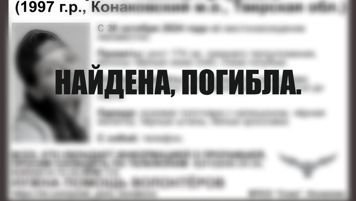 Ранее ТИА писало, что в Конаковском округе Тверской области пропала 27-летняя женщина. Как сообщил тверской волонтёрский поисково-спасательный отряд "Сова", о местонахождении женщины ничего не было известно с 26 октября. Из особых примет в ориентировке пропавшей отмечалось, что у неё на шее справа есть татуировка, а также татуировка "цветы" на правой руке от запястья до локтя. Вечером 9 ноября в группе отряда ВКонтакте обновили ориентировку – пропавшую нашли мёртвой. Как стало известно ТИА, тело пропавшей женщины волонтёры "Совы" нашли в окрестностях города Конаково.