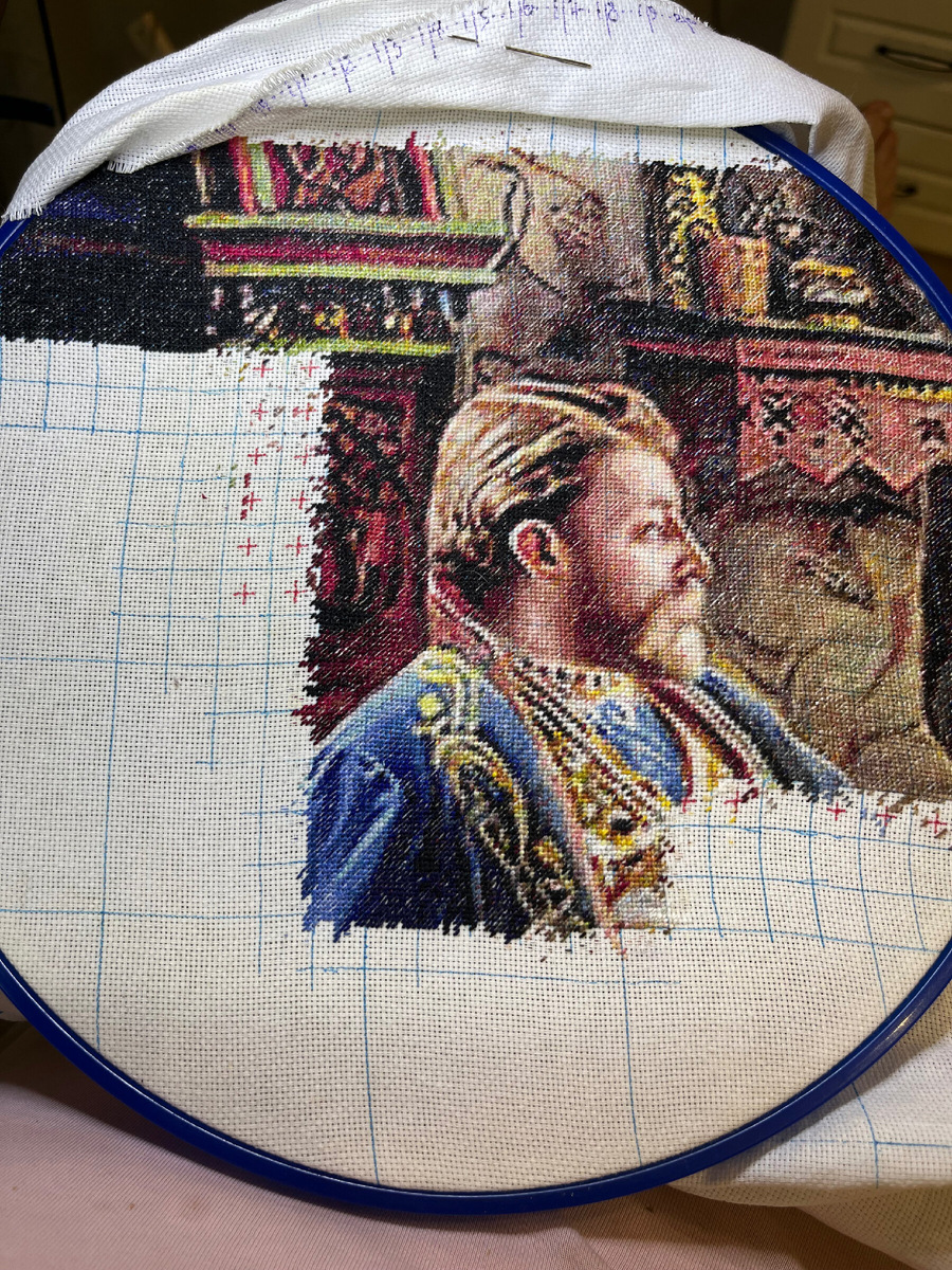 Неожиданно быстро наступило время следующего показа для Гостя). Напомню, что с мая 2024 года я решила "реанимировать" эту незаслуженно отложенную в долгий ящик многоцветку, вышивая хотя бы по 500 стежков в неделю. Все лучше, чем никак). Так Гость выглядел в начале перезапуска этого проекта почти семь месяцев назад. Здесь можно посмотреть начало эпопеи реанимации проекта Предыдущий отчёт Переставила пяльцы, фото в развороте, снова заворачиваемся и следующие 1000 стежков Думаю, что разница с началом перезапуска проекта очевидна). Очень надеюсь, что Гость после нового года будет продвигаться быстрее🤗. И надо продумать вопрос с лупой-лампой - или переносить работу на станок, потому что в руках на пяльцах вышивка вибрирует в процессе и фокус теряется (так я быстрее ослепну, чем вышивать на хардангере без лупы) или крепить пяльцы в какой-то стационарный держатель (парочка имеется). Все-таки годы берут свое и такой мелкий каунт уже плохо видно с моим зрением. Менять уже что-либо поздно,