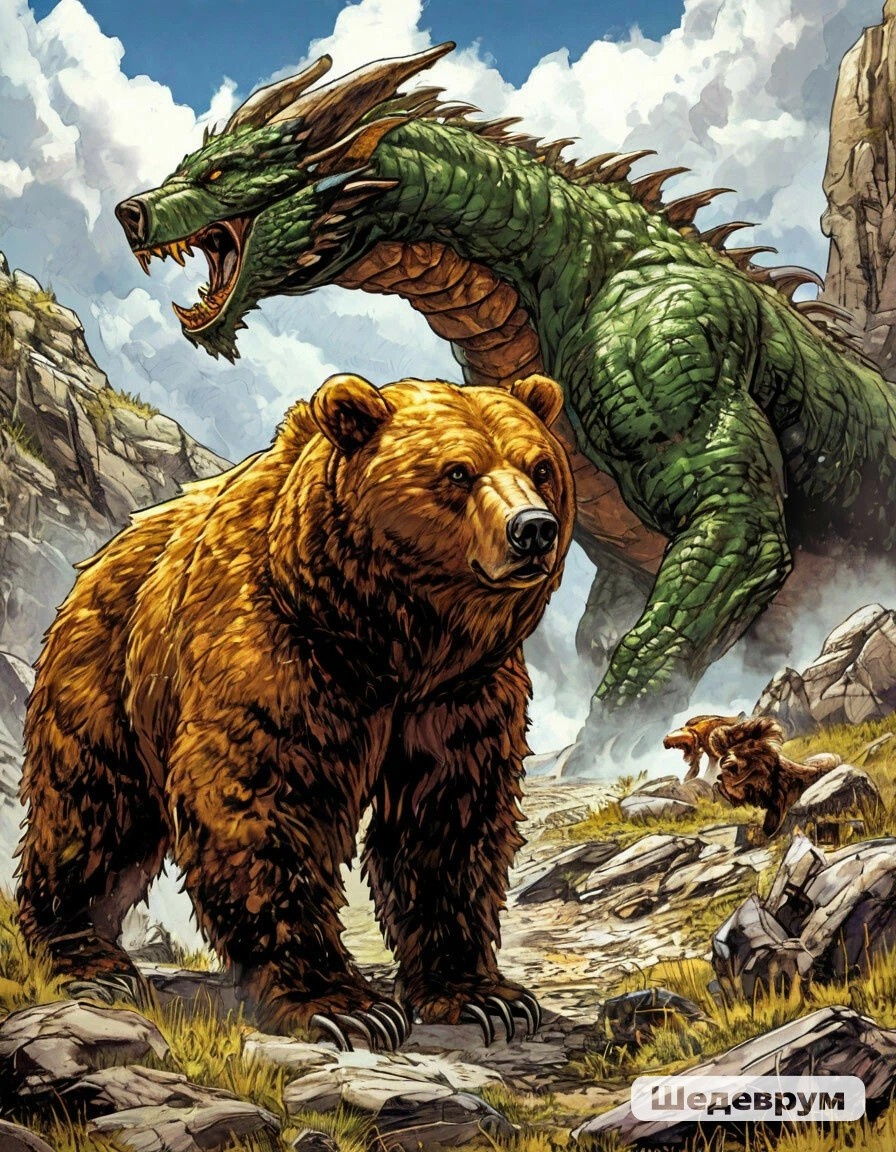 Если человек целеустремлённый и даже если цель амбициозная - найти и уничтожить дракона, то единомышленники найдётся. Их надо ценить больше всех на свет! Здравствуйте мои дорогие подписчики, читатели и гости канала! Цените друзей, они дороже всего на свете! Как и обещал выкладываю очередную часть комикса "В поисках дракона". Медведь по имени Кыр рассказывал свою историю, а подросток по имени Мён его внимательно слушал. И вот что узнал тогда мальчик. Кыр как всегда пришёл на реку ловить рыбу. А рыбы в тот день было необычайно много. Медведь плескался и ловил рыбу. Он наслаждался приятной водой и поэтому с радостью тёпался. И так он увлёкся, что и не заметил, как с гор к нему летел дракон. А когда Кыр увидел дракона он испугался, ведь такую летающую громаду он видел впервые! Да так испугался, что не смог устоять на месте и побежал куда глаза глядят. Однако дракон летел быстрее чем бежал Кыр, поэтому крылатая рептилия быстро настигла медведя. Завязалась драка. В какой-то момент Кыр подум