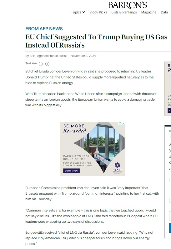 Издание Barrons пишет, что глава Еврокомиссии Урсула фон дер Ляйен в телефонном разговоре с избранным президентом США Дональдом Трампом предложила заменить поставки российского сжиженного природного газа (СПГ) на американский. Поскольку Трамп возвращается в Белый дом после предвыборной кампании, полной угроз введения высоких пошлин на иностранные товары, Европейский союз хочет избежать разрушительной торговой войны со своим крупнейшим союзником, отмечает издание. Во время своей кампании Трамп обещал ввести тариф не менее 10 процентов на весь импорт и другие меры. Цель, по его словам, состояла в том, чтобы нацелиться на страны, которые «обдирали нас годами», и снизить торговый дефицит США. Европейский союз увеличил закупки американского СПГ после начала войны на Украине в 2022 году, но не смог полностью разорвать энергетическое сообщение с Москвой. Председатель Европейской комиссии фон дер Ляйен заявила, что «очень важно», чтобы Брюссель взаимодействовал с Трампом на основе «общих инт