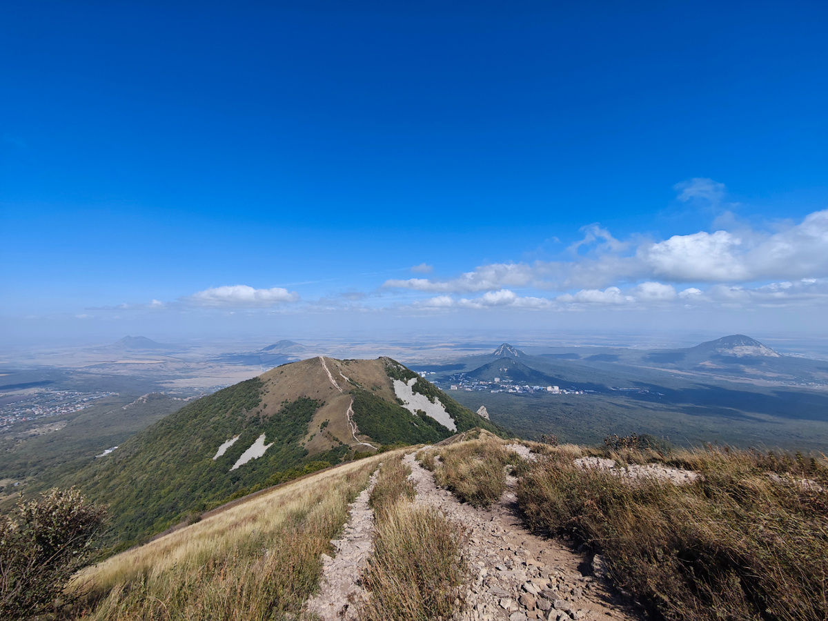 Гора Бештау — сама известная вершина Кавказских Минеральных Вод и одна из самых высоких регионе (1400 метров). Название переводится с тюркского как «пять гор». Это связано с необычной формой массива, который издалека напоминает пять вершин, расположенных рядом друг с другом. Гора дала название окружающей местности (Пятигорье) и городу Пятигорску. Свой путь на вершину я начал в 07:30 утра от площади Ленина. Минут через 20 где-то вдалеке показалась вершина Бештау. Бештау относится к лакколитам — это особая форма рельефа, которая образуется при внедрении магмы в земную кору и её медленном остывании. В результате этого процесса формируется гора с куполообразной вершиной. За 40 минут вышел на окраины города, далее путь пролегал через содовые товарищества. Первые виды……. Гора состоит из главной вершины — Бештау — высотой 1400 м и радиально расходящихся от неё четырёх основных отрогов с вершинами: