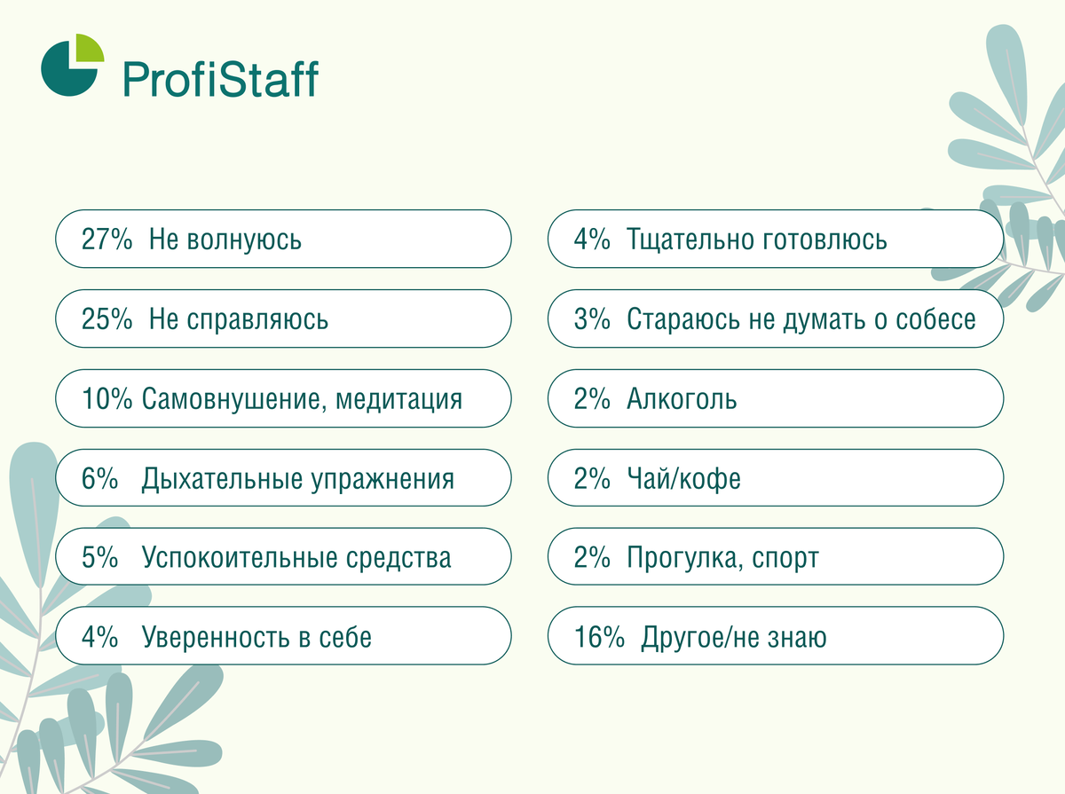 Конкуренция с другими кандидатами, оценка по неизвестным критериям, общение с незнакомыми людьми и полное отсутствие гарантий, что усилия не будет потрачены напрасно – волнение перед собеседованием логично и обосновано: его испытывают 73% соискателей. И 25% с ним ничего не делают: «Иду на страх и риск»; «Позволяю себе волноваться, состояние со временем проходит самостоятельно»; «Там тоже люди. И они тоже ошибаются». Как справляются с остальные? Ответы в инфографике! У женщин по сравнению с мужчинами более популярны аутотренинги (14%), дыхательные упражнения (8%) и прием успокоительных средств (7%). 4 из 100 мужчин признались, что накануне собеседования могут позволить себе горячительные напитки, для женщин прием спиртного перед интервью не характерен. Кадровое агентство ProfiStaff поможет подготовиться соискателям к собеседованию