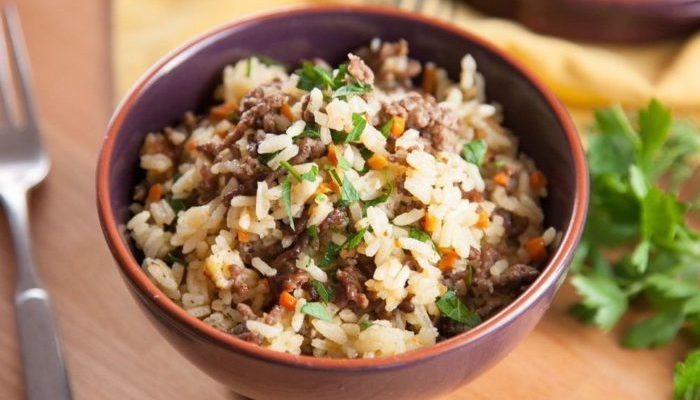 - Разложите рис и выложите на его поверхность фарш и овощи.