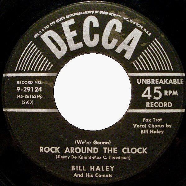С начала года RCA Victor снижает цены на пластинки с 5,95 до 3,98 долларов, ипишки (EP) с 1,58 до 1,49 долларов и синглы с 1,16 до 0,89 долларов. Другие звукозаписывающие компании так же начали снижать цены. Что сделало пластинки более доступными. По различным калькуляторам 1 доллар 1955 года сейчас эквивалентен 11,45$ (с учетом инфляции в США). То есть LP за 4 доллара были примерно, как 48 сейчас, впрочем, многие оригинальные издания 1955 года в состоянии сейчас могут стоить и дороже. 14 января в Нью-Йорке состоялся первый тематический рок-н-рольный концерт. А в июле сингл Rock Around The Clock в исполнении Bill Haley & His Comets занимает первое место в поп чартах Billboard, что было в первый раз для записей рок-н-ролла. Впрочем, обратите на картинку сорокопятки и на надпись стиля танца - Fox Trot. Какие песни были еще в чартах: ✅️️️️️️️ версия шахтерской песни Merle Travis 1946 года Sixteen Tons в исполнении Tennessee Ernie Ford ✅️️️️️️️ прекрасная Only You (And You Alone) в исполне
