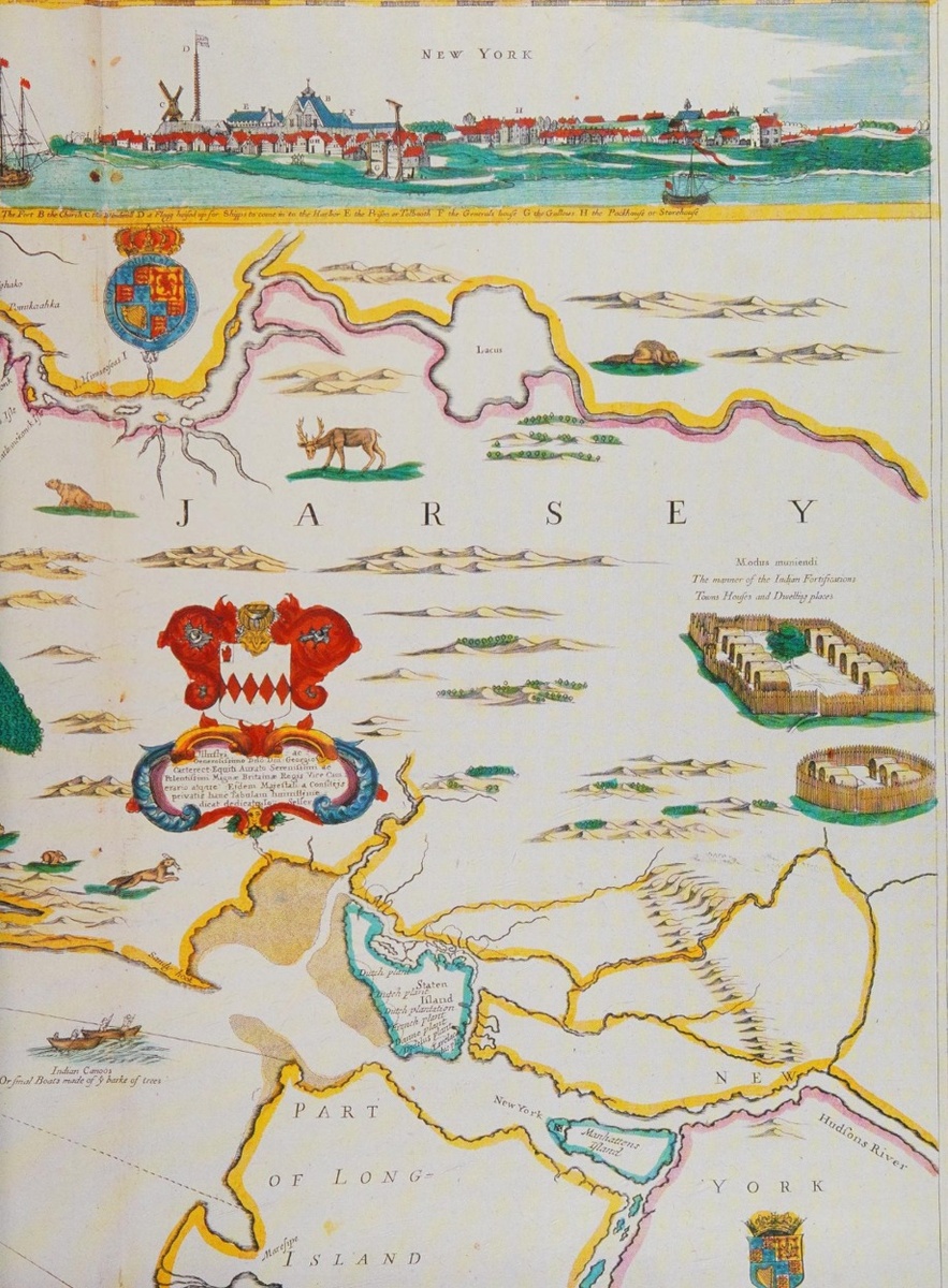 Известно, что полумесяц — это символ ислама. Наличие этого символа на макушке зданий старинного Нью-Йорка намекает на гипотетическую ситуацию, где мусульманская культура и религия были доминирующими в Нью-Йорке. Но был ли такой период? Сомневаюсь. Тогда откуда полумесяц появился на гравюре Нью-Йорка XVII века? Карта Нью-Джерси, созданная Джоном Селлером, была отдельным изданием, выпущенным в Лондоне приблизительно в 1674 году. Это медная гравюра размером 430 х 535 мм и первой печатной картой колонии Нью-Джерси, подготовленной Джоном Селлером, гидрографом при дворе Карла II. После захвата Нью-Йорка британцами в 1664 году, король Чарльз предоставил Джеймсу, герцогу Йоркскому, значительные территории в качестве частной провинции. В свою очередь, герцог передал земли, ставшие частью Нью-Джерси, своим доверенным друзьям, Джорджу Картерету и лорду Беркли. 18 марта 1673 года Беркли продал свою долю квакерам, а Уильям Пенн стал одним из попечителей, учреждая провинции Восточный и Западный Нью-