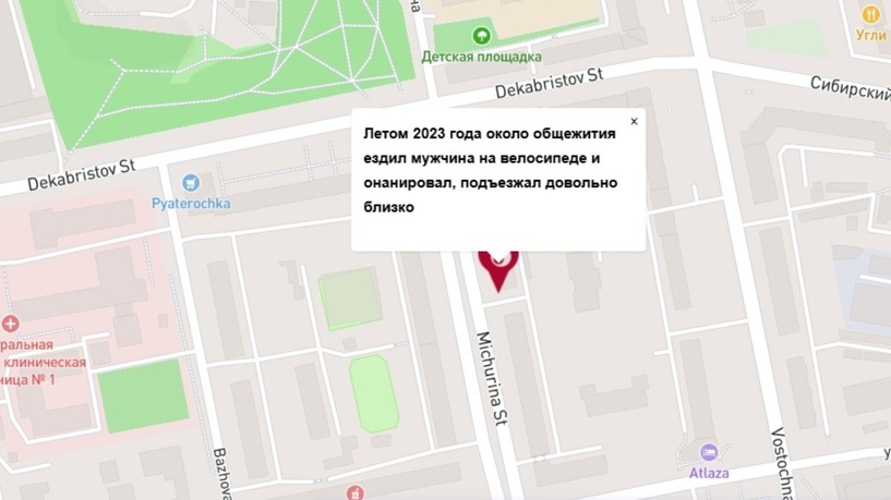 Извращенец на велосипеде катался около общежития торгово-экономического техникума на Мичурина. О событии анонимно рассказали на карте (не)безопасных мест проекта «Попутчица». Неизвестный подъезжал на велосипеде близко в девушкам и онанировал. Инцидент произошел летом 2023 года. На удивление, онанисты-велосипедисты — не редкость. Извращенцев видели в Ставрополе, Липецке, Новороссийске, Новосибирске. Главная новость по теме