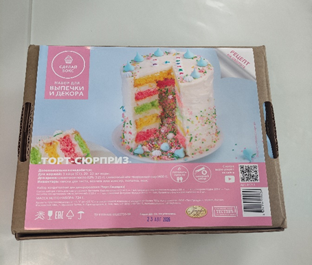 Всем привет! Сегодня расскажу, как мы с детьми готовили Торт-сюрприз из набора для выпечки. Заказали, на всем известном маркетплейсе, вот такой набор для выпечки. На обратной стороне имеется инструкция. Приступаем к распаковке. Внутри есть основные ингредиенты. Дополнительно понадобится: 1. 3 яйца (1С). 2. Масло сливочное 82% жирность 125 г. 3. Сливочный или творожный сыр 400 г. Приготовление. В миску высыпаем смесь для бисквита. Вбиваем три яйца. Добавляем 20-25 мл воды. Необходимо все тщательно взбить миксером (5-10 минут). Должно получиться вот так. Раскладываем равное количество теста по трем формам. Теперь самое интересное, дети были в восторге, именно от этой части приготовления. В наборе есть пищевые красители, основных цвета три, но есть инструкция как получить другие цвета. Добавляем краситель в тесто и перемешиваем, до получения равномерного цвета. У нас получилось вот так. Раскладываем тесто по формам для выпечки и ставим в духовку. (15-20 минут, 180 градусов). После выпекан