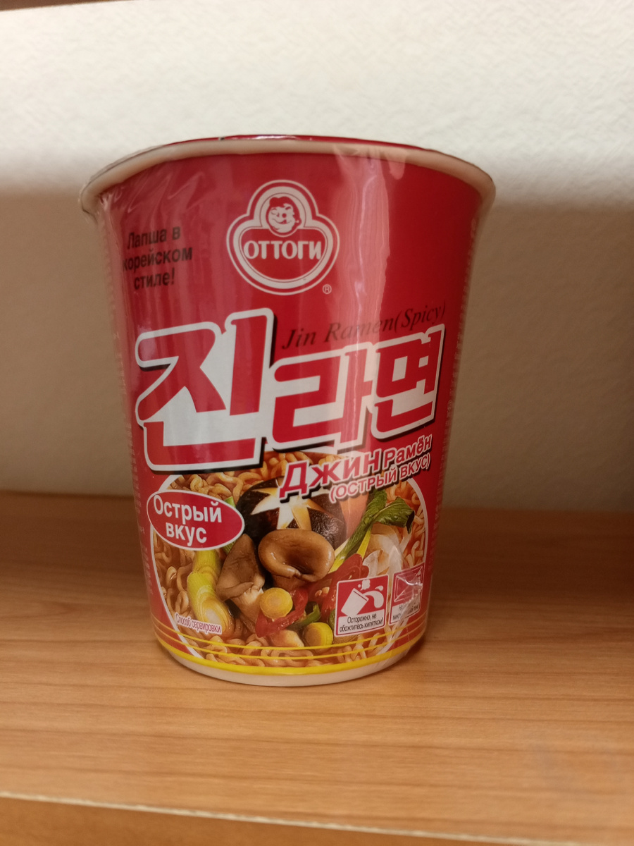 Первым на очереди появился данный стаканчик корейского производителя Оттоги под названием Джин рамён. На упаковке надпись "Острый вкус", нарисовано 2 перца. Многообещающее начало! Куплен в одном из сетевиков за 130 рублей. Особо я от него не ожидал чего-то сверхъестественного, хотя, корейская же.