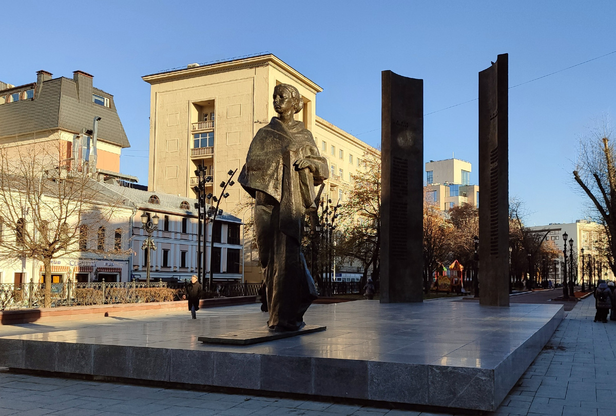 В начале Сретенского бульвара- памятник. Большой. Метра 4 в высоту. Девушка. С интроспективным лицом. То ли в пончо. То ли в большой платок закутанная. То ли куда-то идет. То ли равновесие пытается удержать. На доске. Типа, скейтборд. Прочитал как-то мини- опрос. Проведенный корреспондентом одной из газет. Среди спешащих мимо памятника москвичей. – Что это за дама? Правильный ответ дала только орудующая рядом метлой дворничиха. Крупская Надежда Константиновна. Жена и соратник руководителя молодого советского государства. - Крупский? – наморщит лоб читатель. Не учившейся в советской школе.- Не помню такого. Обычно фамилию на постаменте памятника пишут. А тут- памятник есть. А постамента нет. Только подиум невысокий. Да скейтборд. Задумка скульптора такая. Фамилию все- таки написали. Где? А вот сзади два пилона. Там и написано. Мелкими буквами. - Как так? – удивится читатель -Фамилия одна, а пилонов два? Там еще две цитаты Надежды Константиновны. По одной на каждом. На одном пилоне: «Мар
