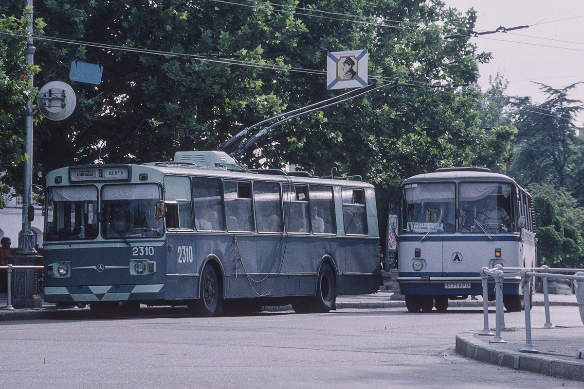 Для начала отправимся в Севастополь. На проспекте Нахимова сошлись два настоящих динозавра (по нынешним временам, конечно же). Автобус ЛАЗ-695Н опережает троллейбус ЗИУ-9, который, судя по значку на его передней части, очень хочет стать "Мерседесом". Переносимся в город Евпатория, который после одного из ливней превратился в настоящую Венецию. Снимок сделан на пешеходной улице Бартенева. Знаменитая трамвайная линия в селе Молочное. На всякий случай напомню - она являлась самой короткой трамвайной системой во всём мире - длина её составляла лишь полтора километра. На фото - трамвай Gotha T57, производившийся в одноимённом городе в ГДР. Переносимся в солнечный Бахчисарай, чтобы посмотреть на главн