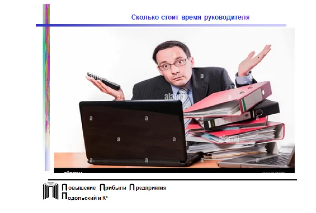 Самосовершенствование уже потому свойственно человеку, что он никогда, если он правдив, не может быть доволен собой. Лев Николаевич Толстой (великий русский писатель) Сколько стоит время руководителя? Самое дорогое, что есть у человека-это его жизнь. Каждый человек (особенно руководитель) хочет прожить ее интересно. Реализовать себя во всех проявлениях жизни: работа-это самоутверждение как профессионала, семья-это поддержания духовной жизни, продолжение рода. Хочется и с семьей больше находиться, и с друзьями встретиться, и хобби уделить внимание, и т.д. Но на все это необходимо время, а его как всегда не хватает. Для руководителя (увлеченного своей работой) работа в основном является самым любимым хобби, это и понятно, здесь он и себя реализует как профессионал и получает достойное материальное вознаграждение. Вот бы еще по меньше нервы «трепать» на работе. Ну, внешние связи деятельности предприятия, понятно – это поставщики, потребители и т.д., «рынок» одним словом, налоги - это зак